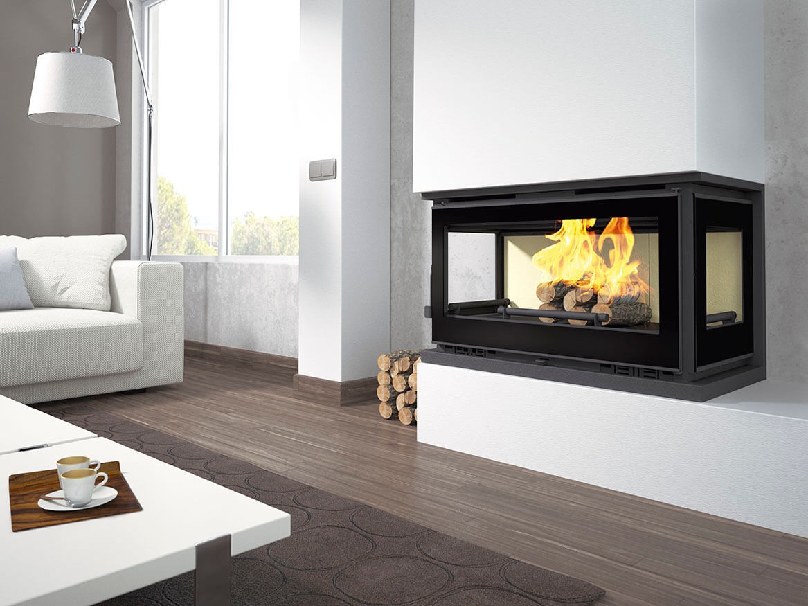 Calefactor a leña Línea INSERTABLE con CRISTAL A 3 lados, Marca FM CALEFACCION (España), modelo IT-173 con 2 boquillas convectoras.