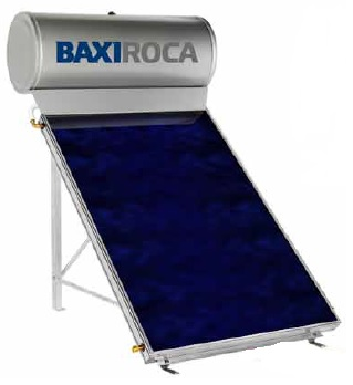 Equipo compacto solar presurizado marca BAXI (España), compuesto por un colector solar, acumulador de 150, 200 o 300 L y todos los componentes necesarios para disponer de agua caliente sanitaria.
