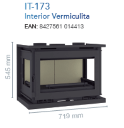 Calefactor a leña Línea INSERTABLE con CRISTAL A 3 lados, Marca FM CALEFACCION (España), modelo IT-173 con 2 boquillas convectoras.